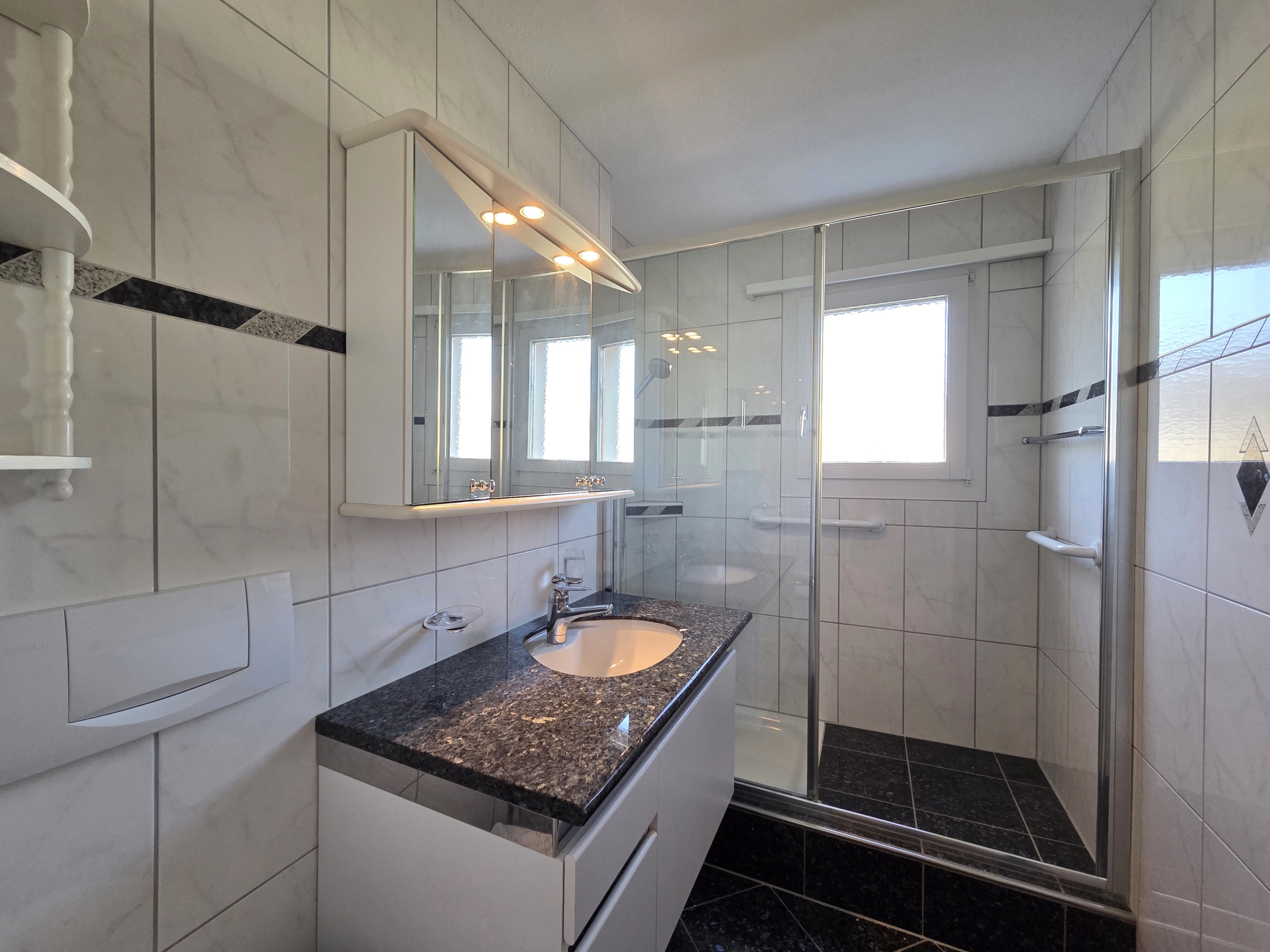 • Badezimmer mit Dusche, Lavabo inkl. Unterbauschrank und Toilette