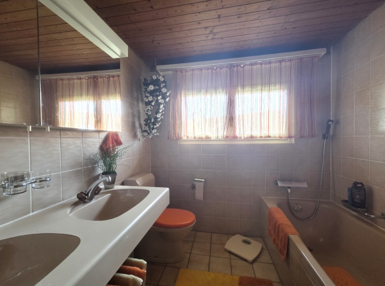 - Badezimmer mit Badewanne, Doppellavabo und Toilette